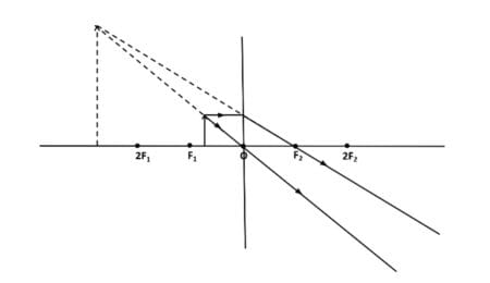 (c) An object is placed at a distance of 12 cm from the optical centre of a convex lens of focal length 18 cm. Draw a labelled diagram to show the formation of image in this case.