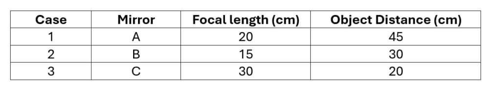 Study the data given below showing the focal length of three concave mirrors A, B and C and the respective distances of objects placed in front of the mirrors: