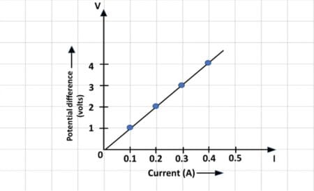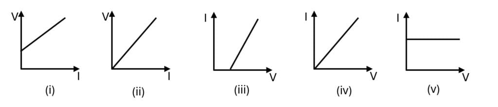 In the experiment to study the dependence of current (I) on the potential difference (V) across a resistor, a student obtained a graph as shown.