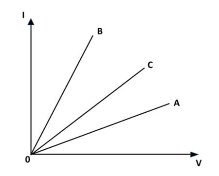 I-V graph for two wires A, B and C are shown in the figure. Arrange the wires in the increasing order of their resistance. Give justification for your answer.
