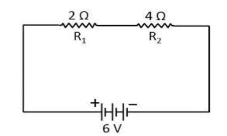 In an electrical circuit two resistors of 2Ω and 4Ω respectively are connected in series to a 6 V battery.