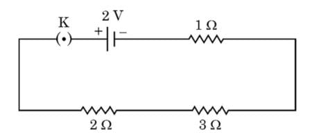 (d) A battery of 6 V is connected with a series combination of five resistors of 0∙1 Ω, 0∙2 Ω, 0∙3 Ω, 0∙4 Ω and 0∙5 Ω. How much current would flow through the 0∙3 Ω resistor ? Justify your answer.