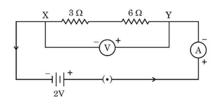 Study the circuit shown in which two resistors X and Y of resistances 3Ω and 6Ω respectively are joined in series with a battery of 2 V.