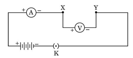 As shown in the diagram, an electric circuit consisting of an ammeter, a voltmeter, 4 cells of 1∙5 V each, a plug key with a gap XY was set up. Voltmeter and ammeter readings were recorded in the observation table for four arrangements as given below : Arrangement No. 1 – only resistor R1 in gap XY
