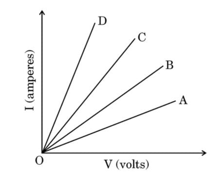 Based on the observations, four V – I graphs A, B, C and D as shown in figure were drawn. Study these graphs.