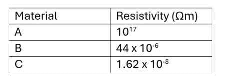The electrical resistivity of three materials A, B and C at 20°C is given below:
